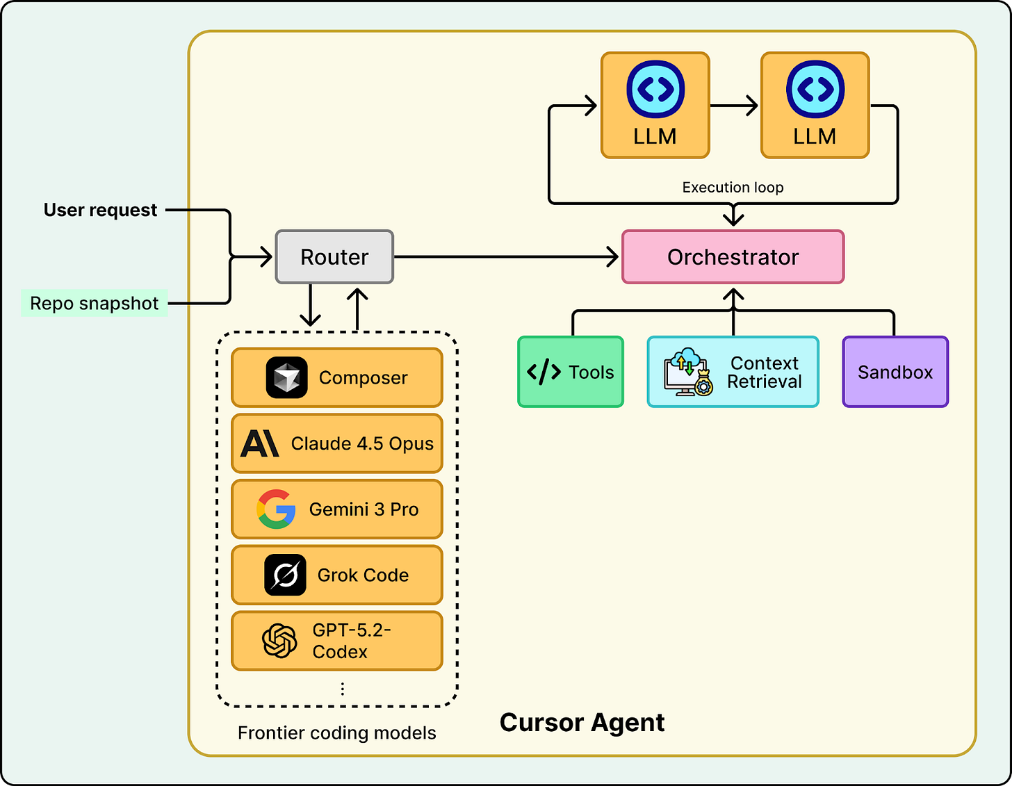 ⚡ ByteByteGo detailed Cursor 2.0's coding agent core principles: trajectory training for improved diff editing accuracy, MoE and speculative sampling for reduced iteration latency, and high-performance isolated sandboxes for code execution safety. Key insight: great coding agents aren't just better models—they're deeply integrated systems engineering.
